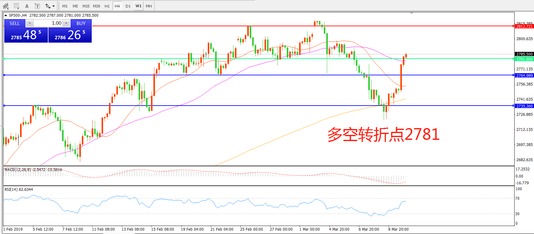 4小时图看,标普500触碰200周期均线后连续反弹,整体走势十分强势,均线系统呈多头排列,MACD绿柱减少,RSI指标拐头,日内延续上行概率较大。