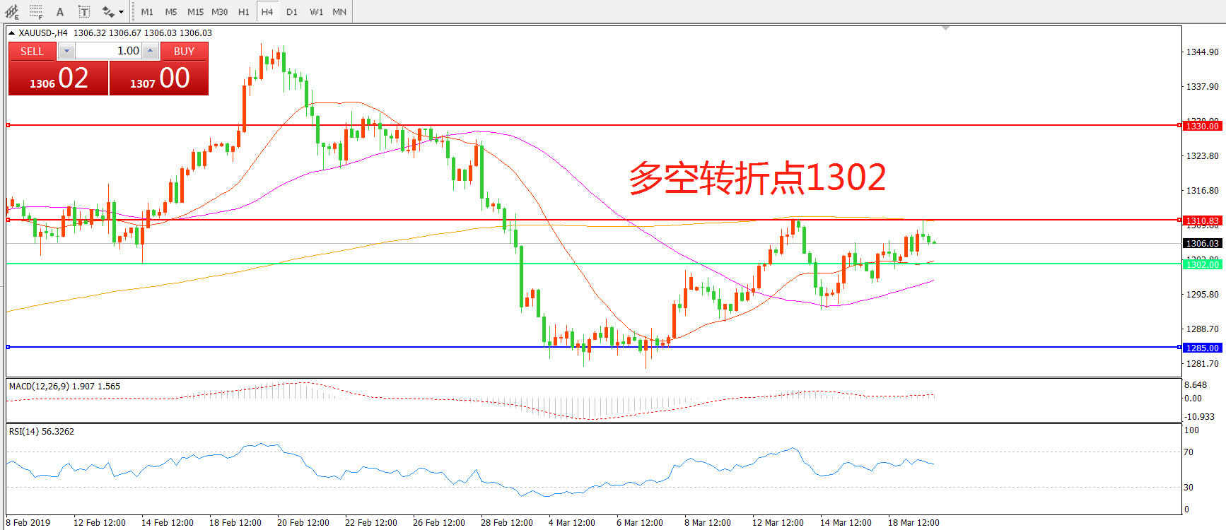 因为没有大的地缘政治事件产生,金价小幅反弹后,于1310附近再次遇阻。目前市场聚焦在周二开始召开的美联储FOMC会议,会议将于周三下午结束并发表声明。目前市场预计美联储不会改变货币政策,在过去数月中,美联储变得更加鸽派。跟往常一样,市场会仔细琢磨FOMC声明及美联储主席鲍威尔的言辞以窥探未来的利率路径和政策。