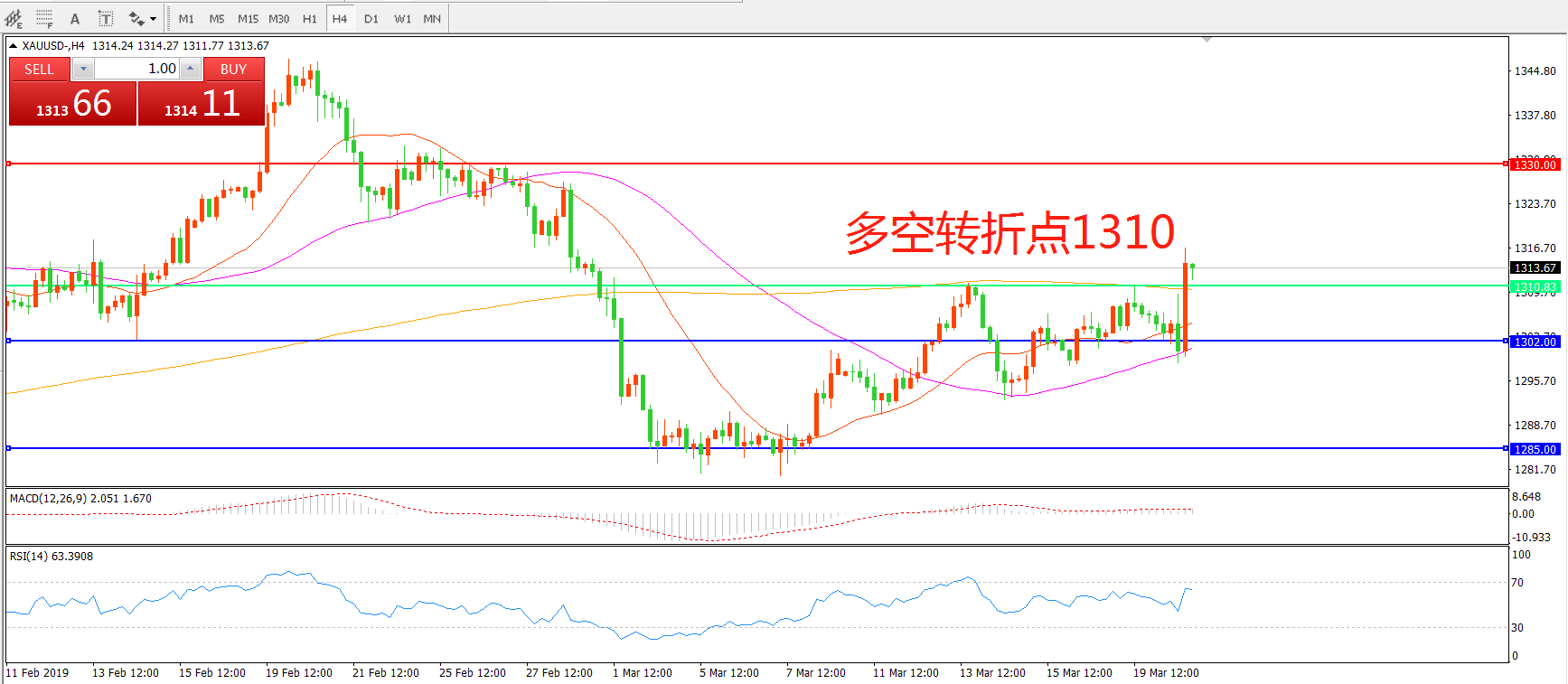 3月20日周三,美联储会后公布的声明显示,全体美联储货币政策委员会FOMC成员一致投票同意,保持2.25%-2.5%的联邦基金利率目标区间不变,多数联储官员的预期今年加息次数从两次降至零,令市场十分意外。美联储主席鲍威尔表示美联储将保持耐心,并保持观望状态,希望维护美国经济强劲增长的前景。记者会期间,美指跌幅扩大至0.66%,黄金暴涨约15美元后回落,最终收报1213.20美元/盎司