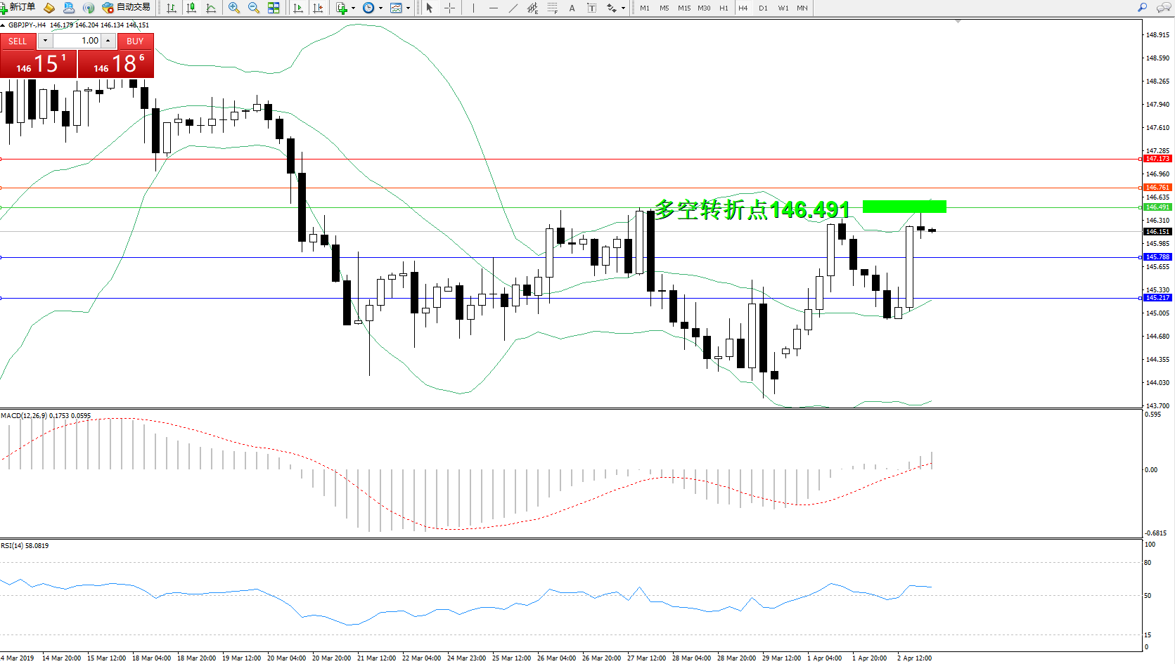 备选策略:146.491上方看涨,目标146.761、147.173