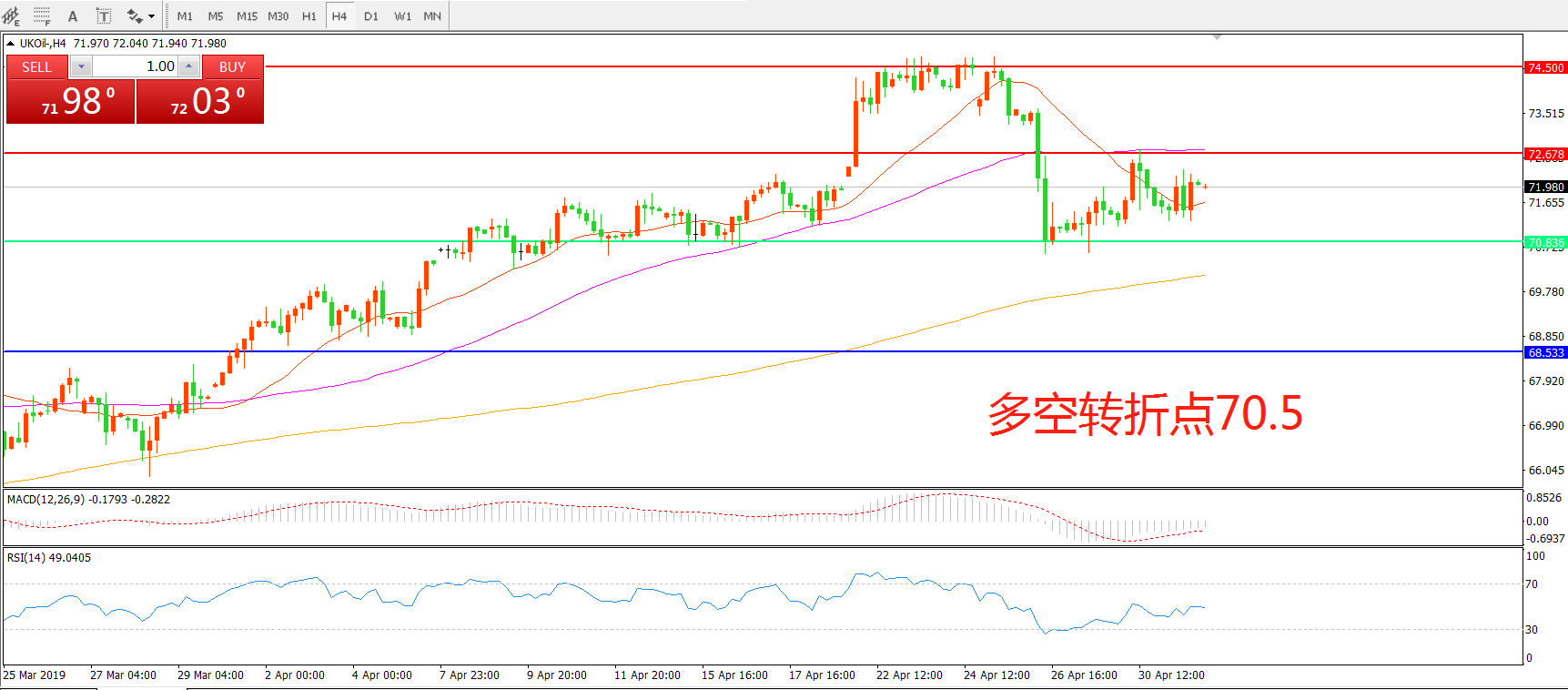 4小时图看,油价冲击72.6阻力后震荡下行,靠近 200均线附近逐渐回暖,日内振幅预计仍将收窄,MACD绿柱减少, RSI指标拐头走平,如能突破上方55均线阻力,油价可能迎来反弹。