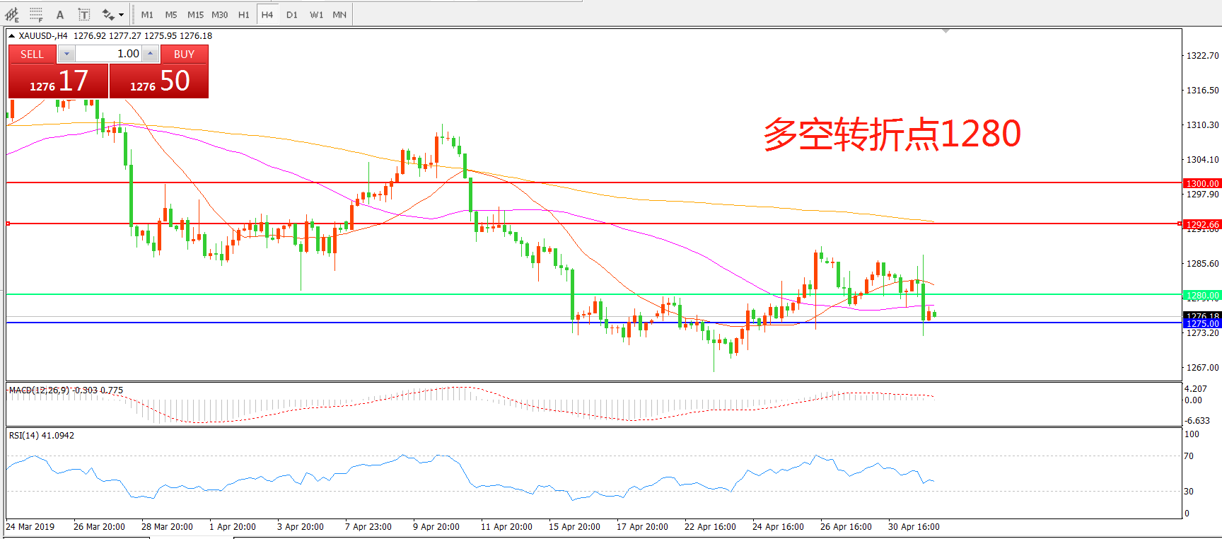5月1日晚间有"小非农"之称的美国4月ADP就业人数增加27.5万人,创去年7月以来新高,预期为18.0万人,利空金价。同时美联储主席鲍威尔示,美联储对目前的政策感到满意,可能会在较长一段时间内维持利率不变,此前美国总统特朗普频频对美联储施加了不同寻常的压力,要求其降低利率,周二表示需要削减1个百分点,受这些言论的影响,美元指数短线急涨,现货黄金则自高位迅速跳水,最终收报1277美元/盎司。中美双方将在北京举行第十轮中美经贸高级别磋商,周五将公布非农就业人口数据,重点关注。