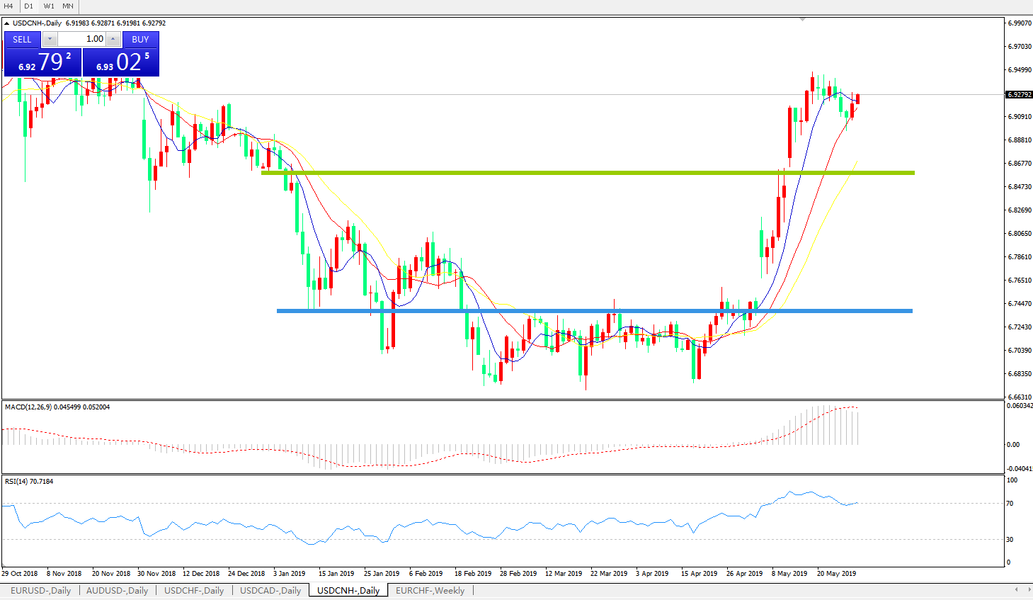技术面简析:日线均线整体维持攻势MACD0轴上方运行但动能柱有缩量迹象RSI超买区域运行,汇价强力上攻后宽幅整理,预计短期汇价下行回踩需求,中期重点关注中美贸易争端后续进展