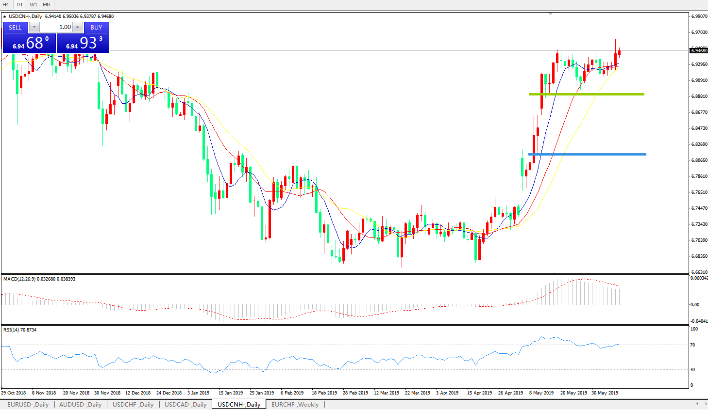 交易策略: 在6.8880之上,看涨,目标价位为6.9600,然后为6.9800。