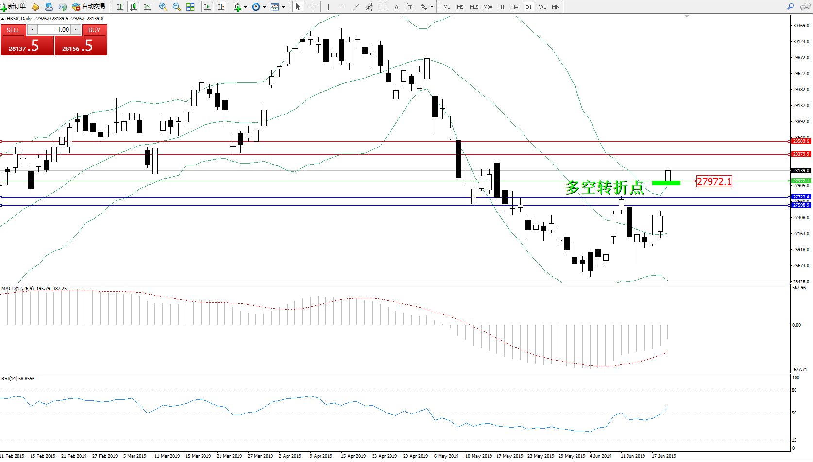 香港恒生指数619日(周三)收盘上涨703.37点,涨幅2.56%,报28202.14点;创今年来最大单日涨幅,恒指大市成交额报1051.49亿港元,显著高于上一交易日(669.02亿港元),创528日以来新高。港股近期有望随外围走势。两国元首电话通话,并将在二十国集团领导人大阪峰会期间举行会晤,显示出外部问题将有所缓和,有助于提振投资者情绪和人气,市场或将迎来一段宝贵的时间窗口,建议积极关注市场的反弹机会。