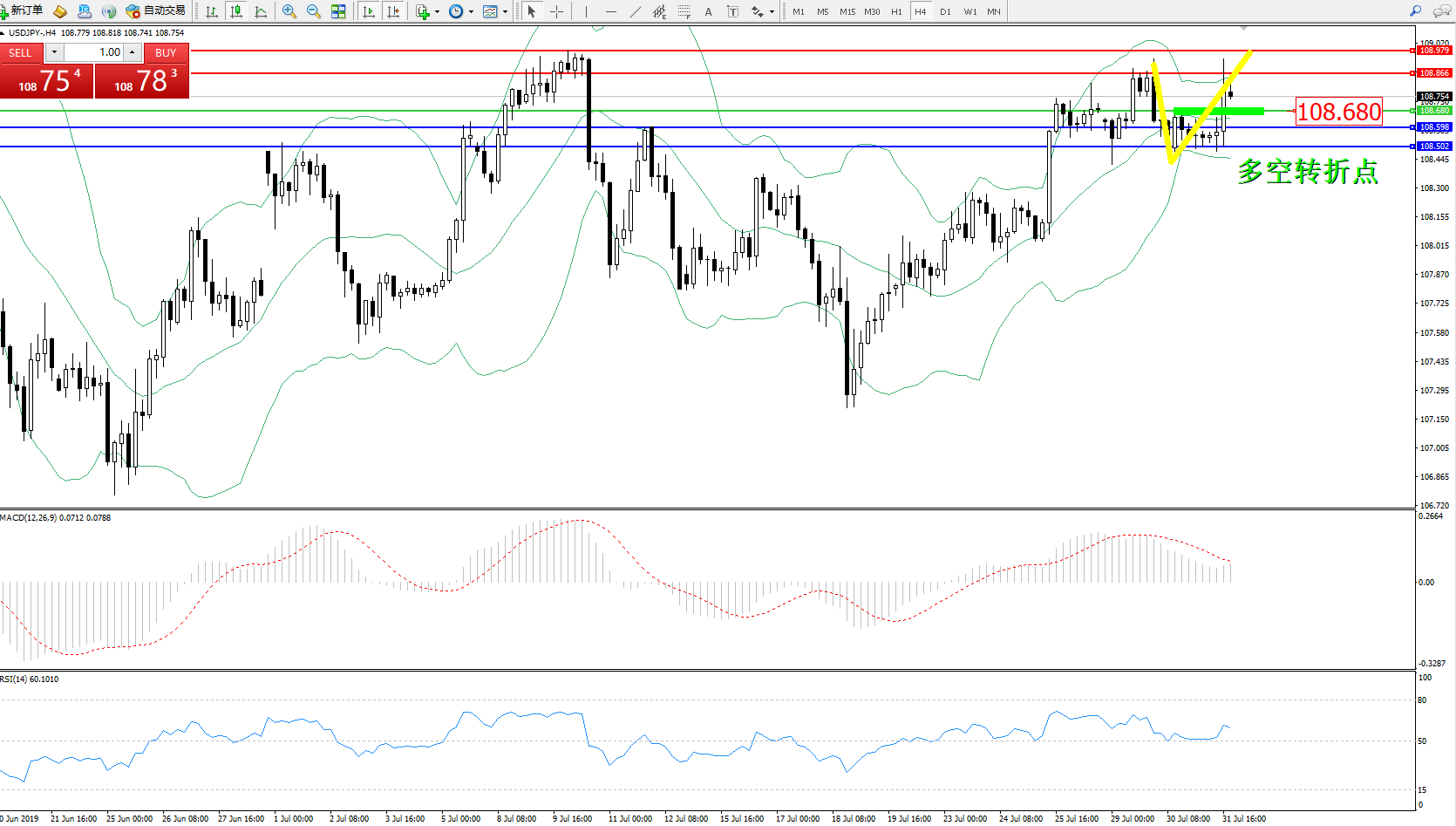 美联储宣布下调联邦基金利率25个基点至2.00%-2.25%。这是200812月以来美联储的首次降息。美日触及109.00关口,关注关口争夺情况,日图目前涨0.36%,创近二个月以来新高。在全球央行进入竞争性宽松周期,日本央行已经基本没有进一步的可用政策储备的背景