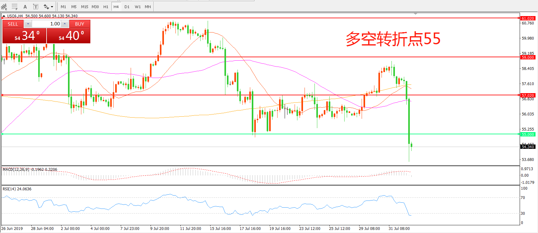美联储议息会议的基调不及预期鸽派,市场认为美国不太可能实施漫长的宽松周期,8月1日,美国总统特朗普表示将对中国输美商品加征新一轮关税引发市场强烈担忧,贸易关系的不确定性让令原油需求面前景面临重大挑战, 美国原油昨日暴跌7.9%,收报54.38美元/桶,创2015年2月4日以来最大单日百分比跌幅。