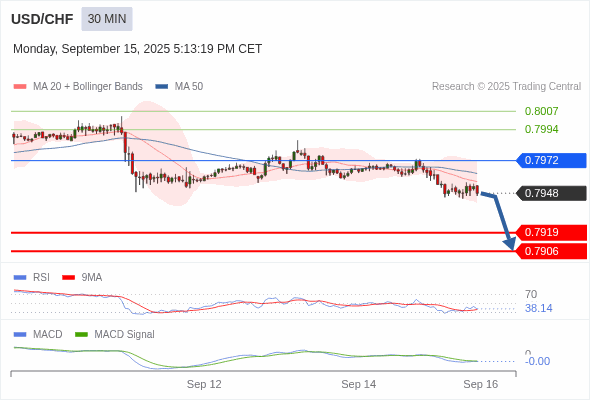 美元/瑞郎 当日内 : 看跌,在 0.7972 之下。