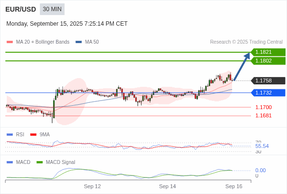 欧元/美元 当日内 : 看涨,当 1.1732 为支撑位,目标定在1.1821。