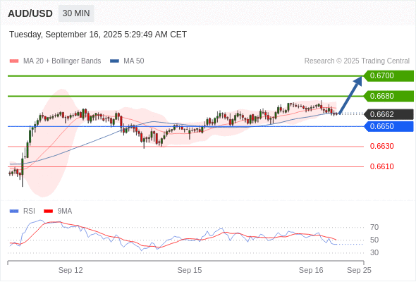 在 0.6650 之上,看涨,目标价位为 0.6680 ,然后为 0.6700 。