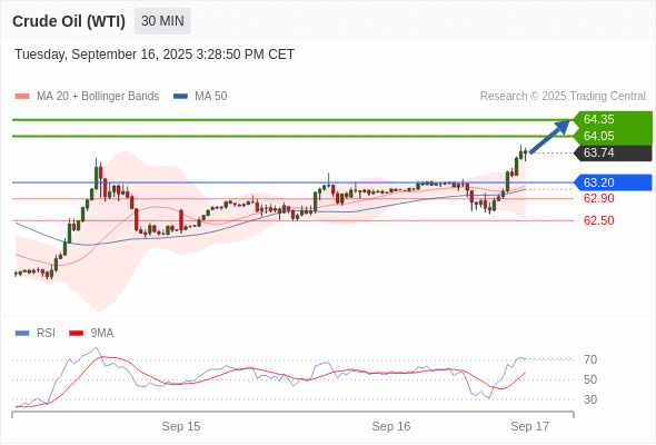 在 63.20 之上,看涨,目标价位为 64.05 ,然后为 64.35 。