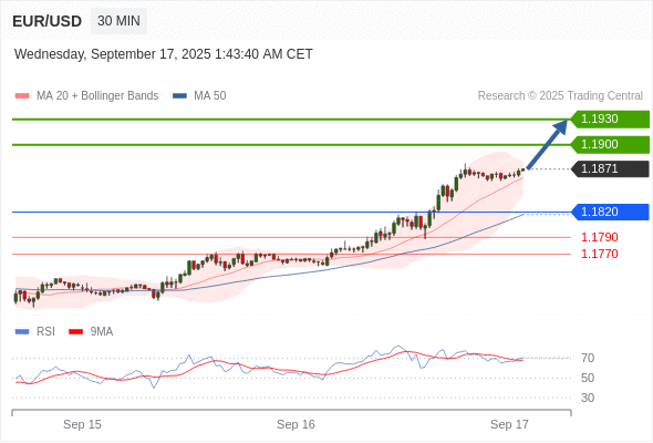 在 1.1820 之上,看涨,目标价位为 1.1900 ,然后为 1.1930 。