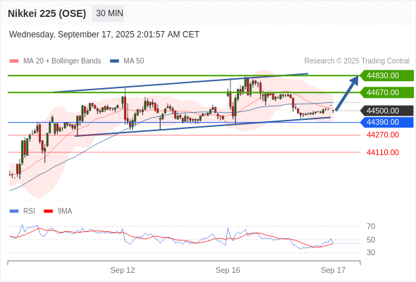 交易策略: 在 44390.00 之上,看涨,目标价位为 44670.00 ,然后为 44830.00 。