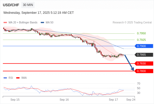在 0.7900 之下,看跌,目标价位为 0.7830 ,然后为 0.7800 。