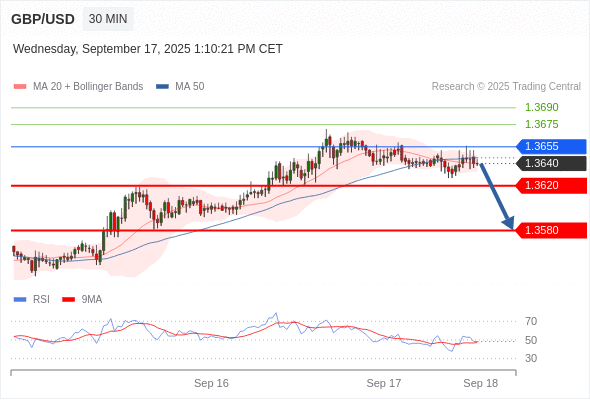 在 1.3655 之下,看跌,目标价位为 1.3620 ,然后为 1.3580 。
