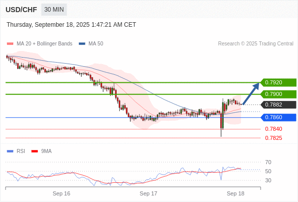 美元/瑞郎 当日内: 在0.7860之上,看涨。