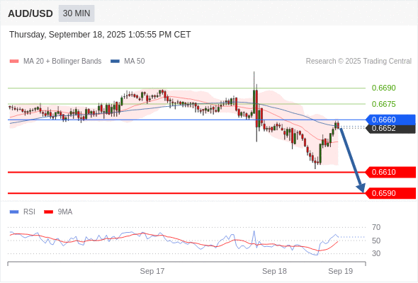 交易策略: 在 0.6660 之下,看跌,目标价位为 0.6610 ,然后为 0.6590 。