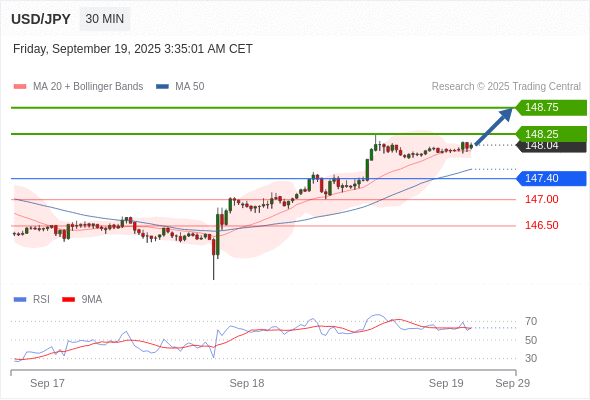 在 147.40 之上,看涨,目标价位为 148.25 ,然后为 148.75 。