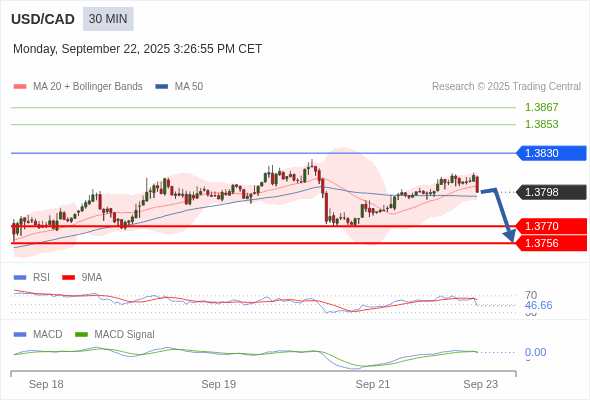 美元/加元 当日内 : 逐渐下跌,当 1.3830 阻碍上行,则 1.3756 为目标位。