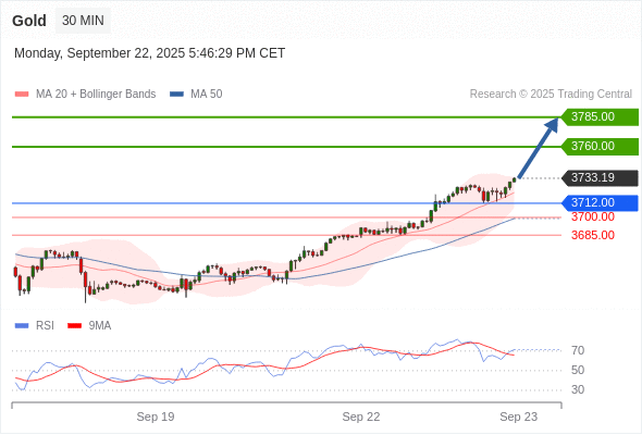 在 3712.00 之上,看涨,目标价位为 3760.00 ,然后为 3785.00 。