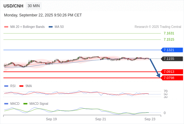 备选策略: 如突破 7.1321 ,USD/CNH 目标方向为 7.1515 和 7.1631 。
