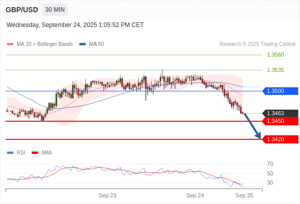 在 1.3500 之下,看跌,目标价位为 1.3450 ,然后为 1.3420 。