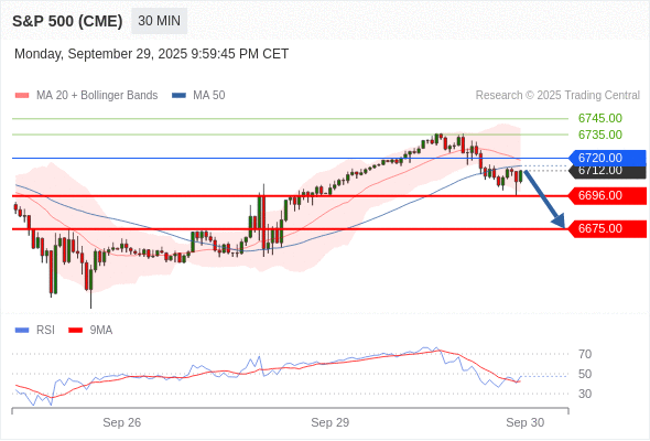 在 6720.00 之下,看跌,目标价位为 6696.00 ,然后为 6675.00 。