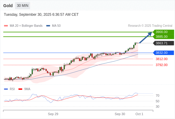 在 3832.00 之上,看涨,目标价位为 3885.00 ,然后为 3900.00 。
