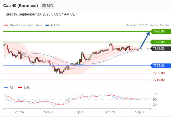 法国CAC指数期货 (Euronext) (V5) 当日内: 在7795.00之上,看涨。