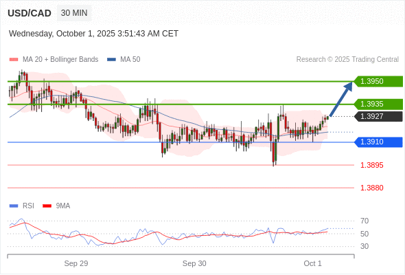 在 1.3910 之上,看涨,目标价位为 1.3935 ,然后为 1.3950 。