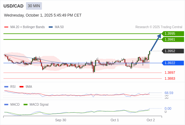 技术点评: RSI技术指标大于中性区域50。 MACD技术指标处在其信号线之上看多。 配置为正。 此外,价位高于其20天及50天移动平均线 ( 分别位于1.3927 和1.3924 )。 最后,价位突破其布林线通道上轨 (位于1.3948。