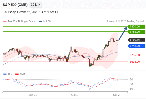 交易策略: 在 6742.00 之上,看涨,目标价位为 6785.00 ,然后为 6800.00 。