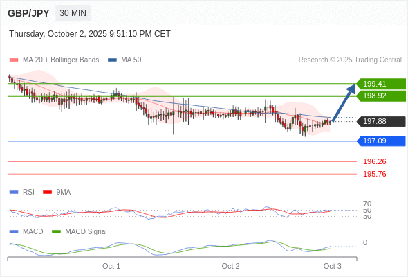 英镑/日元 当日内: 有上涨的可能,目标价位定在 199.41 。