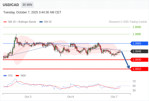 在 1.3965 之下,看跌,目标价位为 1.3930 ,然后为 1.3910 。