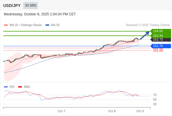 在 151.70 之上,看涨,目标价位为 153.30 ,然后为 154.00 。