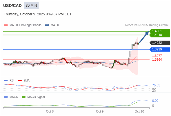 美元/加元 当日内 : RSI是超买的