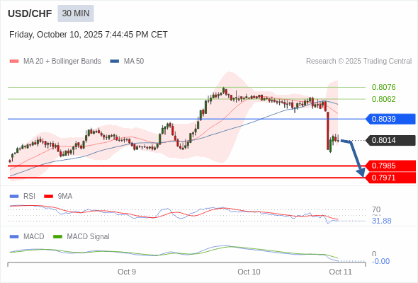 美元/瑞郎 当日内 : 看跌,在 0.8039 之下。