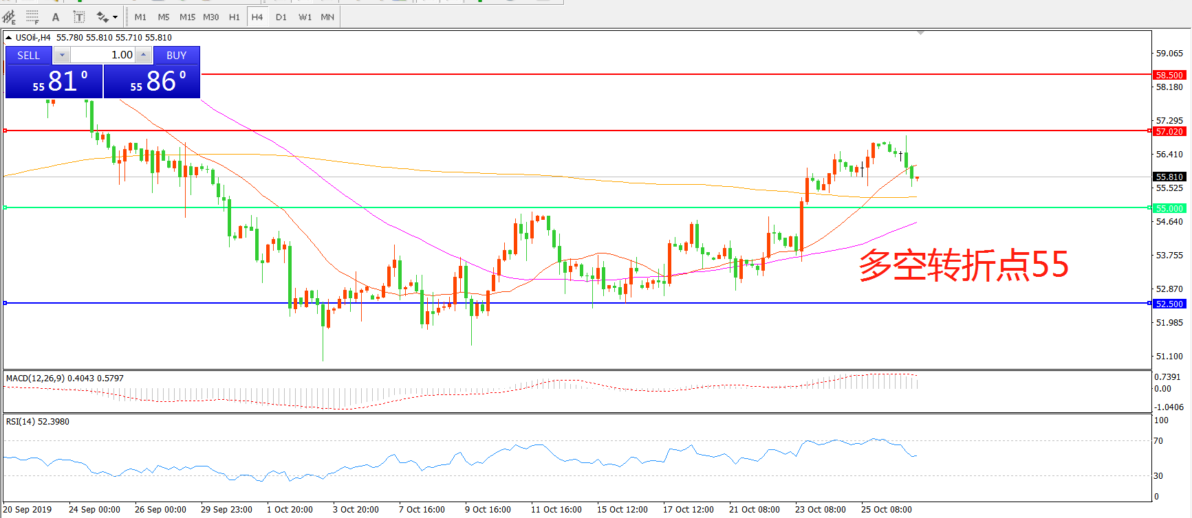 周一(10月28日),虽然中美贸易局势释放积极信号,但美国经济放缓迹象日趋明显令原油需求面前景堪忧,而且中国公布的宏观数据走弱,9月规模以上工业企业实现利润总额连续第二个月下降,美国WTI原油冲高回落,最终收报55.78美元/桶。近来油价的强势反弹除了风险情绪改善以外,最主要是上周EIA库存意外下降的利好提振,不过市场预期本周报告将显示库存增加,务必重点关注。