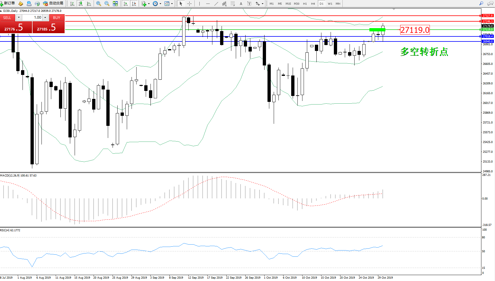 道琼斯指数10月30日(周三)收盘上涨115.30点,涨幅0.43%,报27186.69点。北京时间周四(10月31日)凌晨02:00,美联储宣布降息25个基点至1.5%-1.75%,为年内第三次降息,符合市场预期;在会后的政策声明中,美联储删除了“采取适当措施”的承诺。美联储称,劳动力市场依然强劲,经济活动以温和的速度增长。企业固定投资和出口依然疲软。近几个月平均就业增长稳健,失业率仍然在低位。家庭支出一直以强劲的速度增长。以12个月为基础的指标看,整体通胀率和扣除食品及能源的通胀率都低于2%。基于市场的通胀补偿指标依然在低位;基于调查的较长期通胀预期指标几乎没有变化。