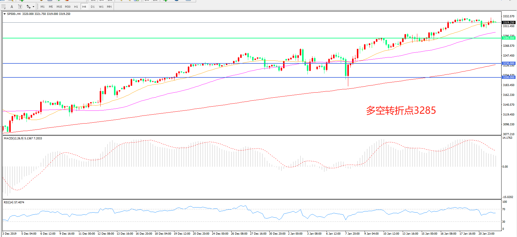 4小时图看,标普500延续高位震荡,整体走势依然强劲,均线系统呈多头排列,MACD红柱增加,RSI指标向上,日内震荡上行概率较大。