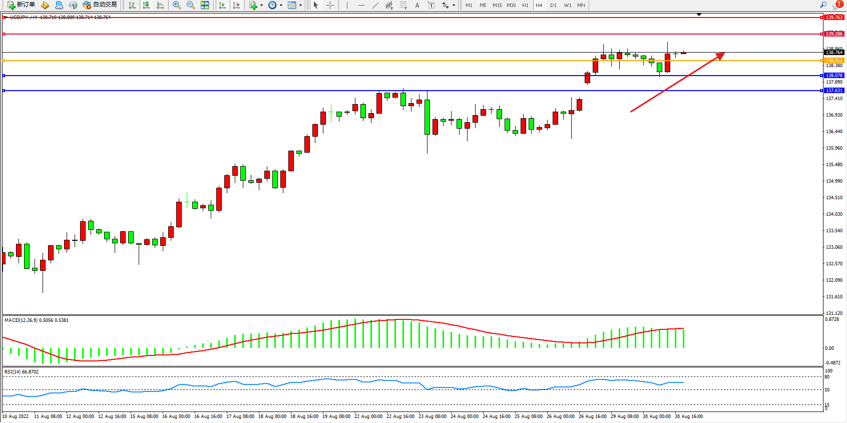 4小时图看:多头动力持续震荡上扬,高位窄幅整理平移,市场多头依旧有进一步向上移动态势,MACD指标处于多头区域维持整理平移,RSI指标处于多头区域窄幅震荡;