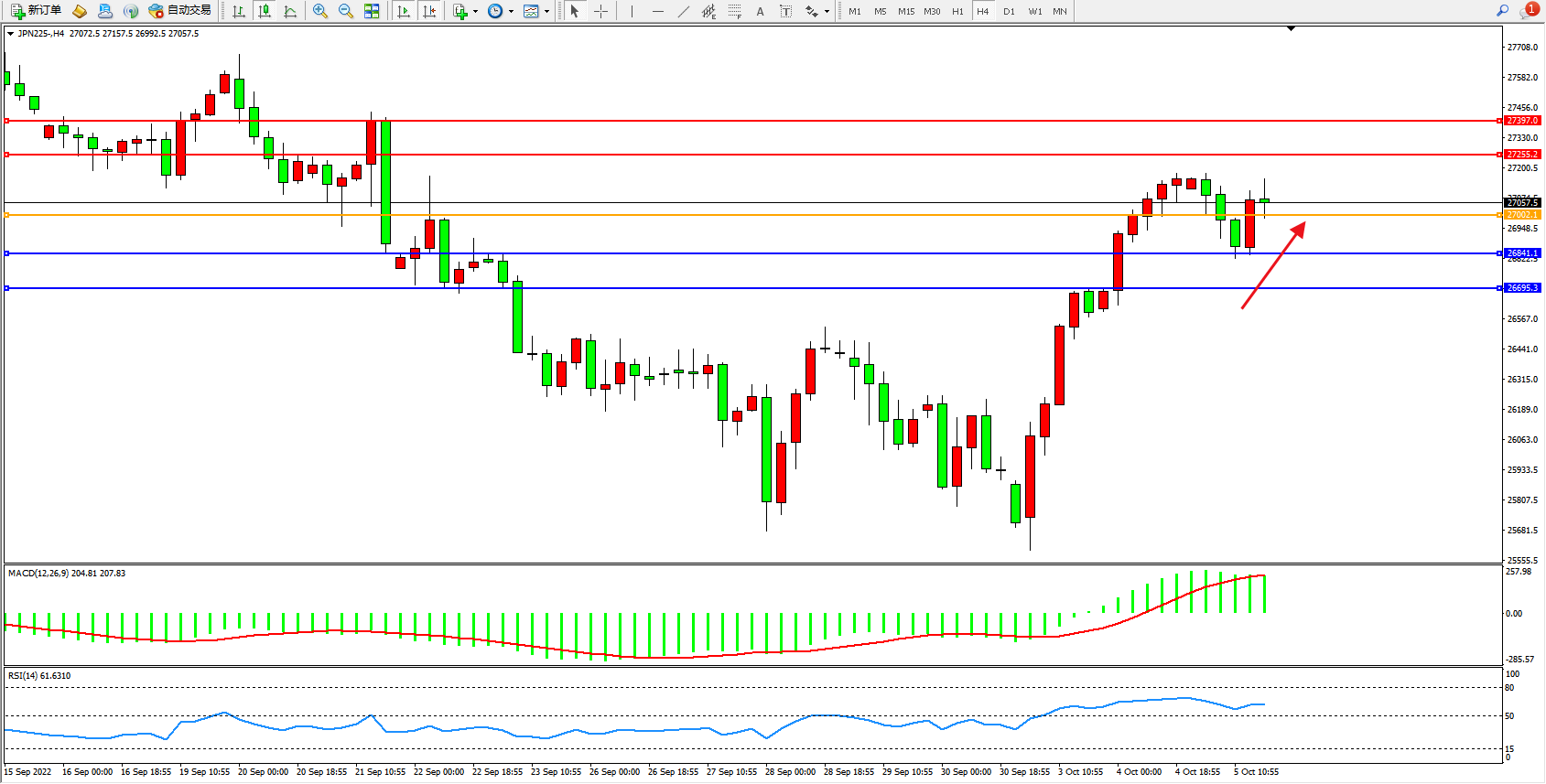 日经指数JPN225——4小时K线图显示: