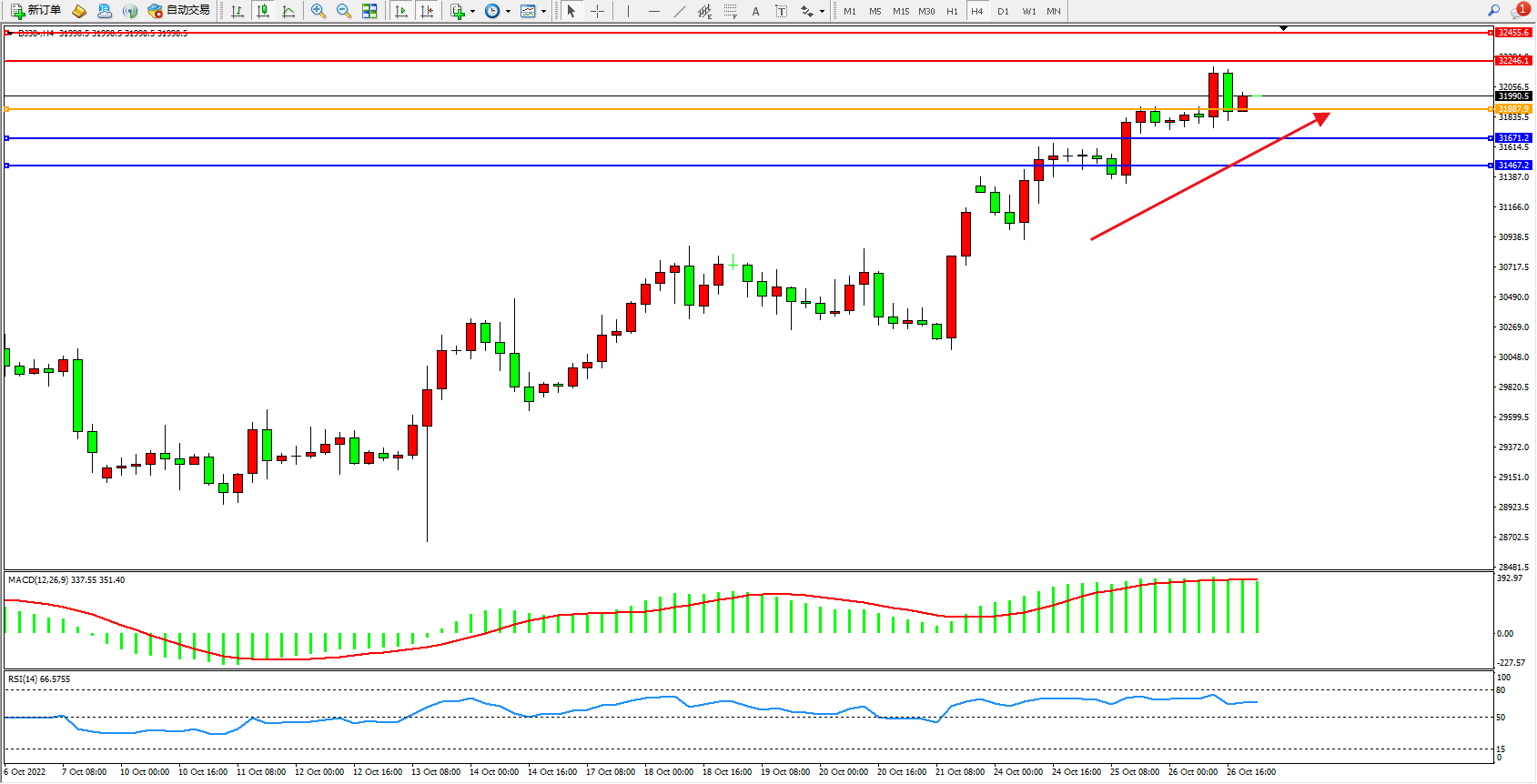 道琼斯指数10月26日(周三)收盘上涨3.36点,涨幅0.01%,报31840.10点;美国经济数据不佳加剧了对美联储将放慢加息速度的猜测,美元指数刷新9月20日以来低点至109.932。