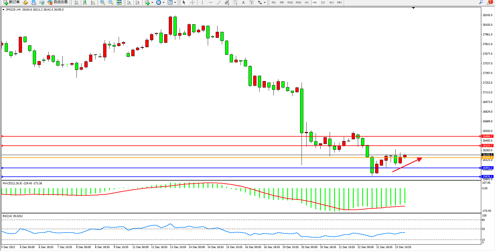 日经225指数12月23日(周五)收盘下跌294.37点,跌幅1.11%,报26213.50点。日本11月核心消费通胀率达到3.7%的40年新高,因企业继续将上涨的成本转嫁给家庭,这表明物价上涨正在蔓延到更广泛的经济领域。这样的增幅令人质疑日本央行有关最近成本推动型通胀将是暂时的观点,并可能让市场继续预期央行明年将进一步缩减大规模刺激措施。