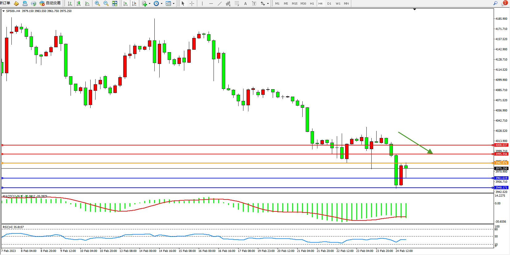 标普500指数2月24日(周五)收盘下跌41.12点,跌幅1.02%,报3971.20点;美国PCE数据:利率市场认为,美联储下个月会议加息50个基点的风险正在上升。与3月22日会议相关的OTS合约暗示加息33个基点,即有28%的几率加息50个基点。