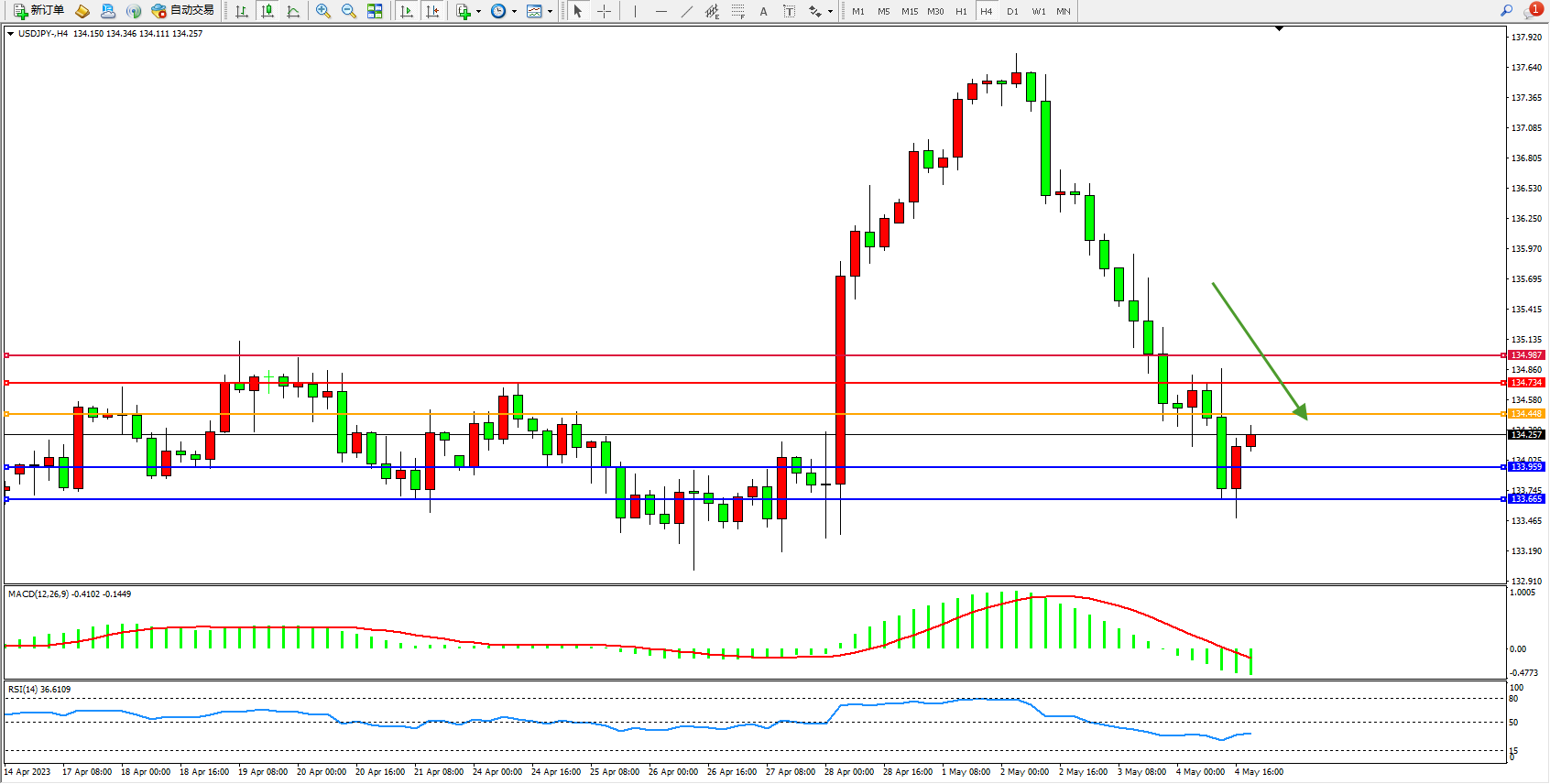 交易策略:134.448下方看跌,目标133.959 133.665