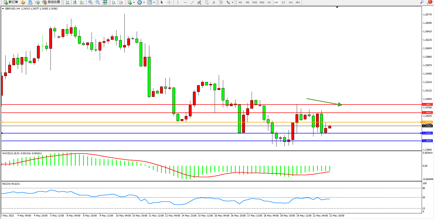 英镑兑美元维持1.24363附近震荡,英国好于预期的经济表现,美国通胀降温以及六月加息进程有望停止的预期导致的美元下滑,从而扶助了英镑。若本周反映英国通胀的数据还是表现强顽,则会增加英国央行六月加息的概率,料想也会刺激英镑的回升。