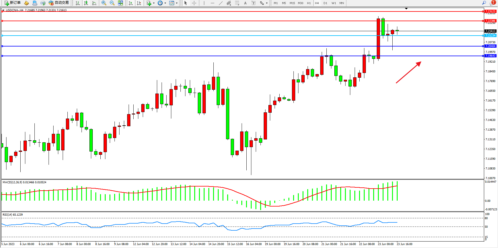 交易策略:7.21234上方看涨,目标7.22386  7.23123