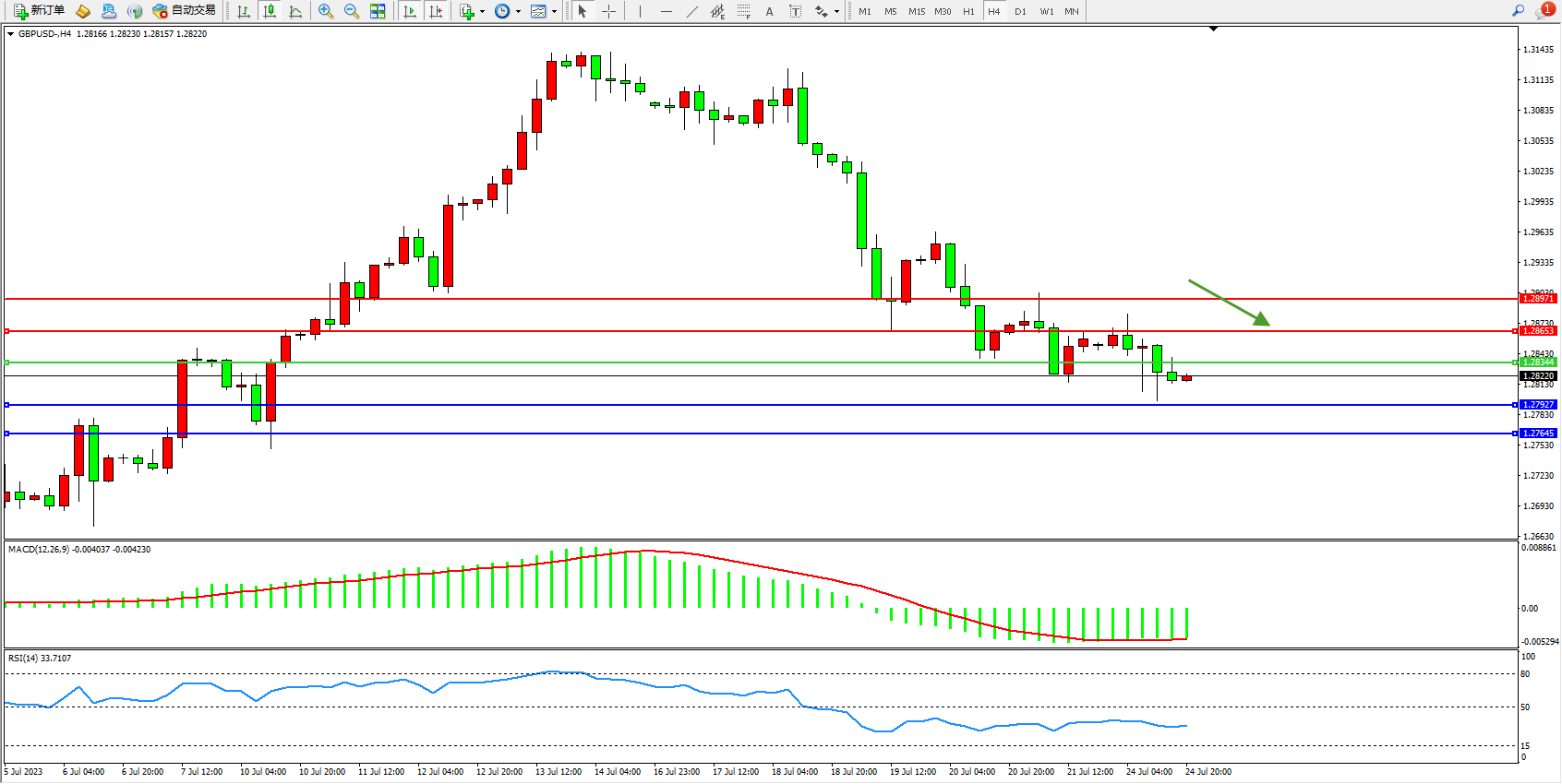 交易策略:1.28344下方看跌,目标1.27927 1.27645