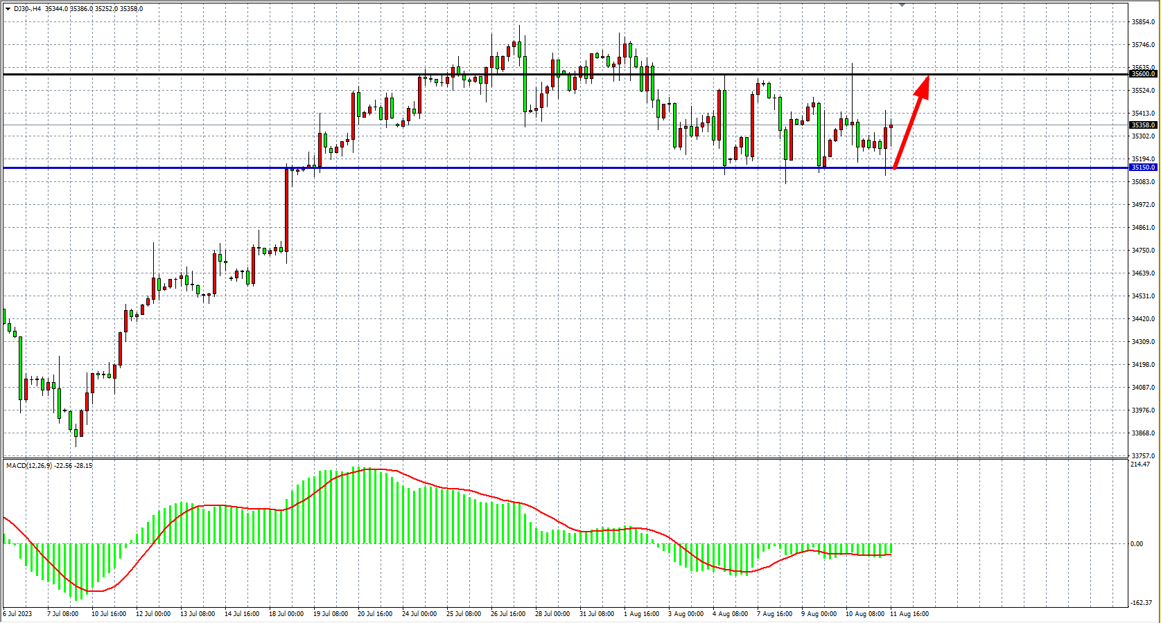 4小时图看,道指在35150附近受支撑反弹,在35600附近再度受阻回落,MACD在零轴下缩量,行情继续维持高位整理,支撑关注35150,阻力关注35650。